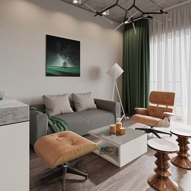 Еще один проверенный вариант, который тоже встречается в природе – это сочетание зеленого с серым. Гостиная в таких цветах выглядит элегантно и нежно. Дополнить все можно серебристыми узорами на тюле. Впрочем, это только основные цвета, которые хорошо смотрятся в сочетании с зеленым. Можно использовать и другие оттенки, главное, чтобы все смотрелось естественно.