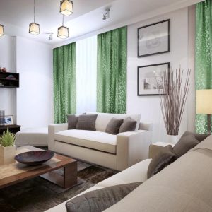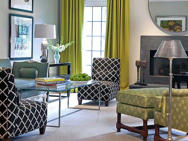 Немаловажно и то, с какими другими оттенками будут сочетаться шторы, подбираемые для гостиной. Казалось бы, самый легкий вариант – собрать в одной комнате несколько оттенков зеленого. Но и тут есть определенные подвохи. Специалисты не рекомендуют совмещать в одном помещении более 3 оттенков одного цвета, иначе комната будет выглядеть безвкусно. Из всех цветов активным должен быть только один – это еще одно правило, которого точно стоит придерживаться.
