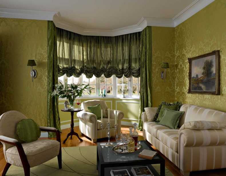 Комбинации занавесей цвета зелени с остальными интерьерными элементами