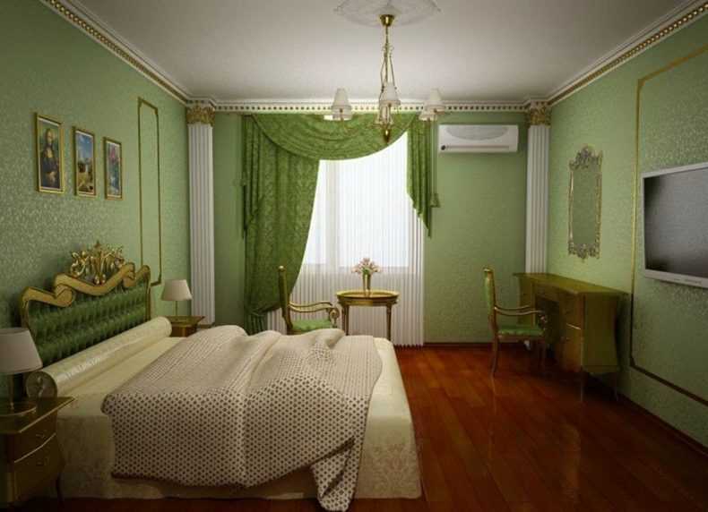 Для классического стиля характерно использование сдержанных оттенков, позволяющих подчеркнуть элегантность и роскошь стилистического направления. Натуральные материалы, деревянное напольное покрытие, каменная плитка, будут хорошо смотреться на фоне зелёной спальни.