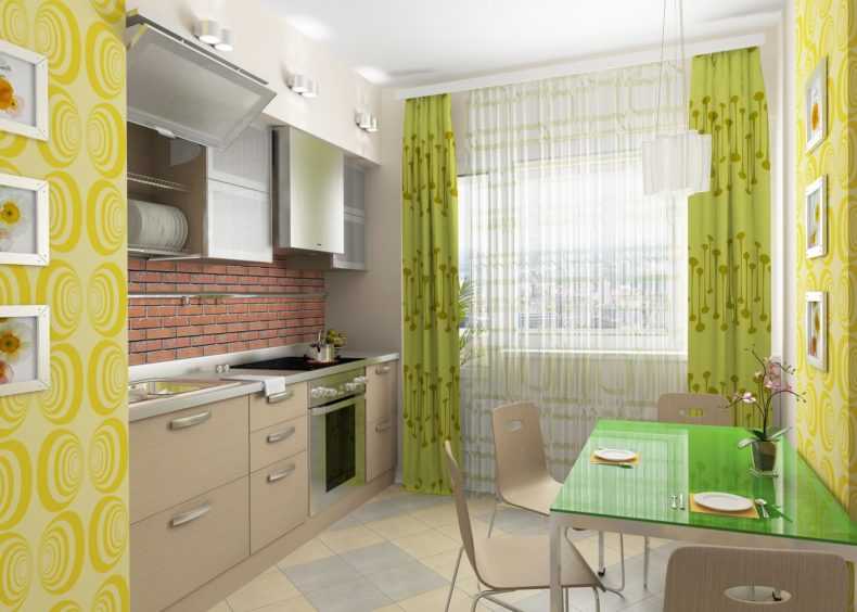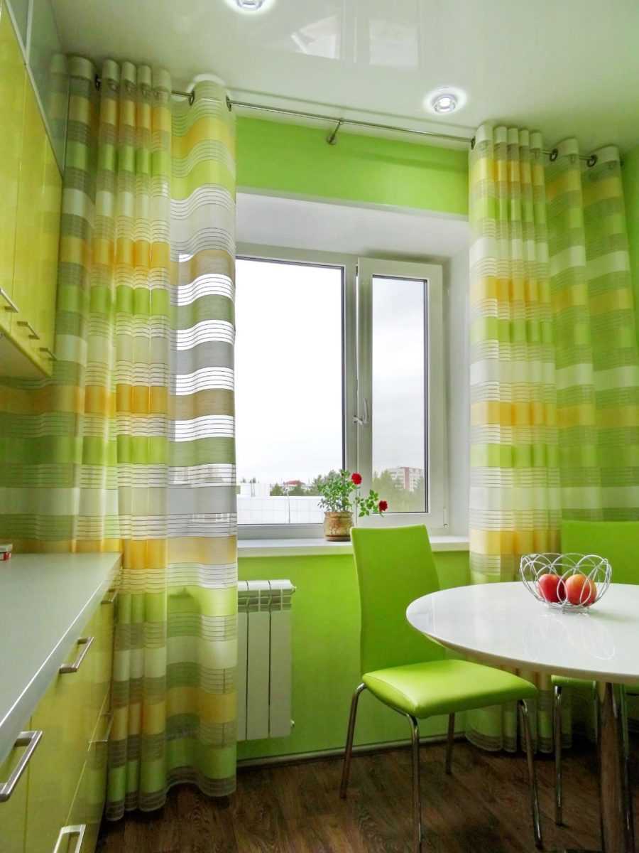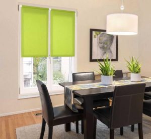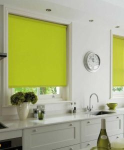 - Кухня. Различные зеленые шторы пастельных оттенков успокоят атмосферу и уберегут от чрезмерного переедания. А вот зеленый с преобладанием желтого оттенка наоборот, добавит энергии и возбудит аппетит. Обычно на кухню вешают компактные короткие занавеси из-за небольшого размера помещения. Например, удачным вариантом окажутся салатовые римские шторы с рисунком.