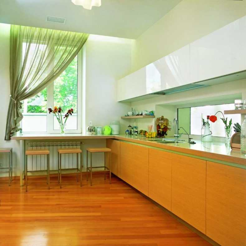 На кухне нужно быть особенно внимательными с цветовой гаммой: свежие холодные тона с примесью голубого или синего помогут не переедать, а теплые желто-зеленые наоборот возбуждают аппетит. По фактуре отдавайте предпочтение простым и легким тканям (хлопок, лён) и тюлю. Занавески могут быть как в пол, так и до подоконника — либо сочетать оба варианта. Популярный вариант — рулонные или римские шторы.