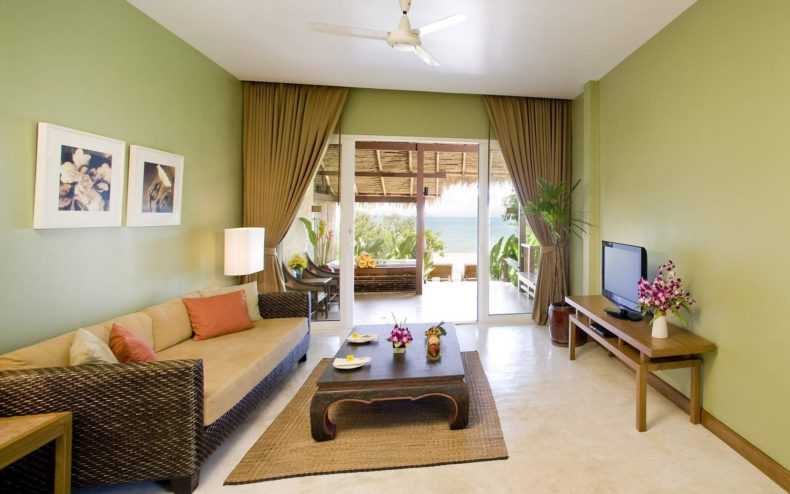 Подобная комбинация встречается и в природе. Поэтому гостиная в таком стиле станет отличным местом для отдыха. Светлая бежевая или коричневая мебель или стены станут отличным фоном для красивых салатовых или темно-зеленых штор.