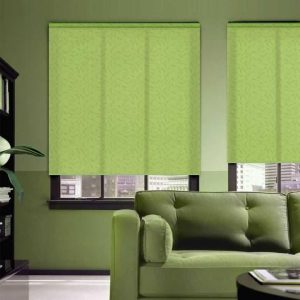Не часто, но все же встречаются в современных дизайн-проектах и интерьеры с японскими шторами зеленых оттенков. Японские шторы представляют собой тканевые полотна без складок, полностью закрывающие оконные проемы. Их еще часто называют текстильными экранами. Лаконизм и практичность таких штор отлично вписывается в современную стилистику. Чаще всего подобные вариации декорирования окон встречаются в однотонном виде, но и принтованные тканевые экраны способны украсить интерьер любого помещения.