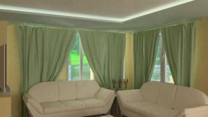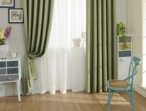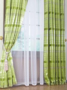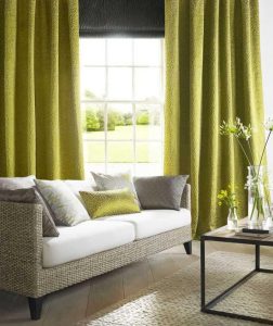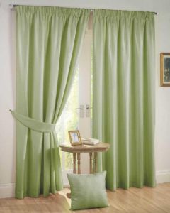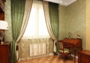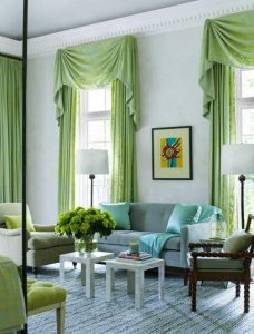 - Сочетание с другими цветами. Подбирая занавески, нужно заранее определиться, с какими другими элементами интерьера они будут сочетаться. Так, например, связующим элементом могут выступать предметы мебели, остальной текстиль или отделка нейтрального оттенка того же цвета. Удачные комбинации с зеленым дадут следующие цвета: глубокий синий, белый, серый, холодный коричневый, желтый, голубой, бежевый.