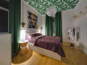 Различные оттенки зелёного можно использовать для зонирования спальни, это могут быть обои, напольное покрытие, перегородки из ткани.