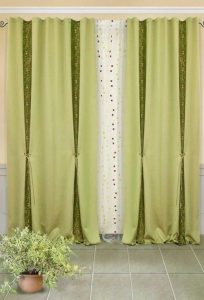 Чтобы шторы из зеленых материалов выглядели уместно, нужно обеспечить им цветовую поддержку. Их цвета можно полностью дублировать с оттенками разных предметов, к примеру, с тоном стен, паласами и ковриками, осветительными приборами, или же комбинировать с подходящими по цветовой гамме.