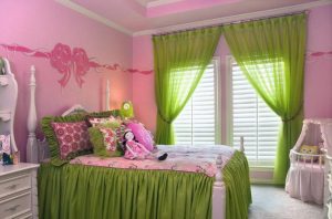 - Детская. Здесь будут уместны теплые оттенки зеленого, например, салатовый. А чтобы порадовать ребенка и сделать интерьер нескучным, выбирают занавески с природным рисунком. Для активных малышей выбирают оливковые портьеры. Они успокаивают и настаивают на учебный лад.