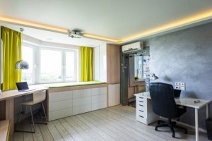 Вместо плотных штор в детской спальне рекомендуется использовать зеленые рулонные шторы. Из общего материала легко сшить ламбрекен, наволочки для дивана и накидки на кресла однокомнатной квартиры.